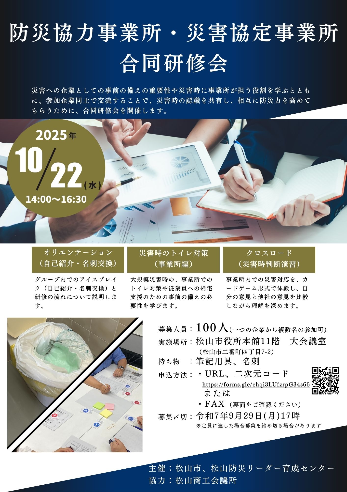 防災協力事業所・災害協定事業所の合同研修会を行います。ご参加ください。